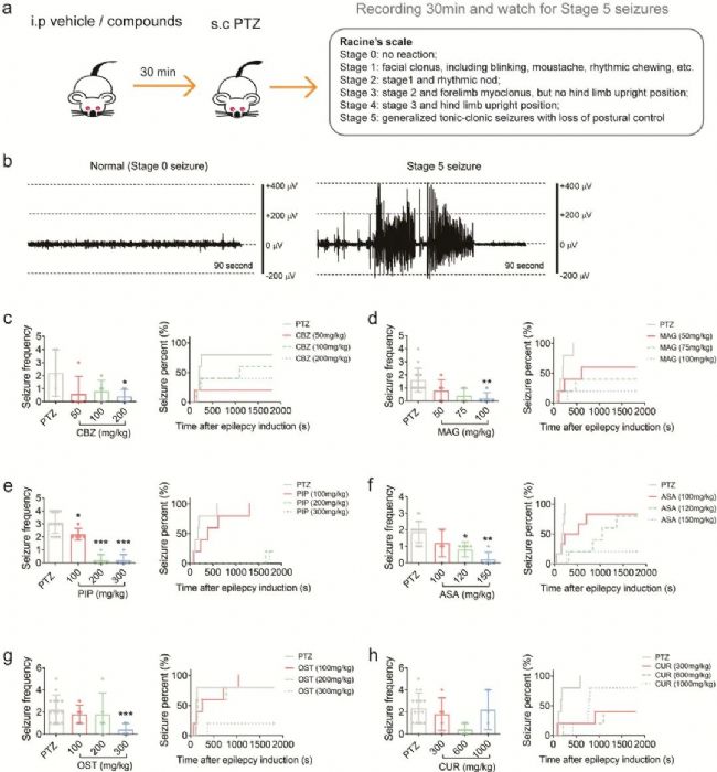 為了進(jìn)一步比較體內(nèi)和體外模型的一致性,研究者在PTZ誘導(dǎo)小鼠癲癇模型中,測試了在iPSCs誘導(dǎo)神經(jīng)元中表現(xiàn)出抗癲癇作用的8種天然化合物的抗癲癇能力。200mg/kg 卡馬西平降低了小鼠的全面強(qiáng)直陣攣發(fā)作頻率;100mg/kg厚樸酚顯著降低了癲癇發(fā)作頻率,并延長了首次癲癇發(fā)作的潛伏期;胡椒堿在100 mg/kg、200 mg/kg和300 mg/kg劑量下顯著抑制癲癇發(fā)作次數(shù),并有明確的劑量依賴性反應(yīng);α-細(xì)辛腦在120 mg/kg和150 mg/kg時(shí)具有顯著抑制作用;蛇床子素在300 mg/kg時(shí)具有顯著的抑制癲癇作用;300 mg/kg和1 g/kg劑量的姜黃素延長了癲癇發(fā)作的潛伏期,但對(duì)癲癇發(fā)作次數(shù)無顯著影響,提示有輕度抑制作用(圖5)。研究者還在小鼠急性發(fā)作模型中評(píng)估了在iPSCs誘導(dǎo)神經(jīng)元和斑馬魚中篩選出的6種陰性化合物,即白楊素,天麻素,白藜蘆醇,槲皮素,川芎嗪和丹參酮ⅱa,結(jié)果顯示這些化合物均未降低癲癇發(fā)作頻率,也未延長首次癲癇發(fā)作潛伏期。