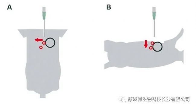 圖2:麻醉雌性大鼠腫瘤微環(huán)境中pH監(jiān)測示意圖:腫瘤位置(黑色)和微傳感器注射點(紅色)的腹側(cè)(A)和側(cè)視圖(B),隨著腫瘤生長而移動
