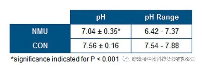 表1:荷瘤(NMU)和健康(CON)大鼠最后實驗周的尿液pH值。數(shù)據(jù)表示為平均值±標準差或范圍值。
