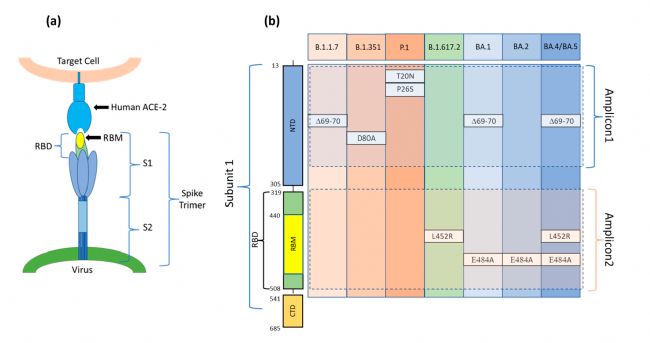 圖 1. (a) 刺突蛋白由三個(gè)刺突單體組成,在 SARS-CoV-2 表面形成同源三聚體結(jié)構(gòu)(刺突三聚體)。每個(gè)單體分為兩個(gè)亞基,即 S1 和 S2,在弗林蛋白酶切割位點(diǎn)連接。在病毒融合過程中,S1 亞基中的受體結(jié)合域 (RBD) 與宿主細(xì)胞靶受體 ACE2 結(jié)合,而 S2 則實(shí)現(xiàn)膜融合。 (b) SARS-CoV-2 S蛋白S1亞基的示意圖和氨基酸序列。每個(gè)變體中存在的突變位置,包括 擴(kuò)增子1(S 蛋白編碼序列中的位置 23 至 289 nt)和 擴(kuò)增子2(S 蛋白編碼序列中的位置 1215 至 1545 nt)。 S1:胞外域S1亞基; S2:胞外域S2亞基; NTD:N 末端結(jié)構(gòu)域;RBD:受體結(jié)合結(jié)構(gòu)域;RBM:受體結(jié)合基序; CTD:C 端結(jié)構(gòu)域。