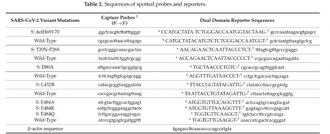在該研究中,該研究團(tuán)隊(duì)設(shè)計(jì)雙域核酸探針,區(qū)分域用于特異性結(jié)合S蛋白突變序列PCR擴(kuò)增產(chǎn)物(表一),編碼結(jié)合域能與芯片表面捕獲探針特異結(jié)合(表二和圖二)。PCR產(chǎn)物標(biāo)有Cy3染料,可被熒光掃描儀檢測(cè)。(圖三)。