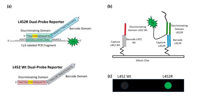 圖 2. 實(shí)驗(yàn)示意圖。 (a) 在 L452R 突變的情況下(包含點(diǎn)突變的核苷酸三聯(lián)體以黃色突出顯示,突變以紅色突出顯示),L452R 雙域核酸探針在溶液中與 Cy3 標(biāo)記的單鏈 PCR 雜交,而 L452 Wt 報(bào)告基因則無(wú)雜交。 (b) 雙域核酸探針 3' 不同編碼的結(jié)合域(不同顏色代表序列差異)通過與芯片表面相應(yīng)捕獲探針雜交將標(biāo)記的 PCR產(chǎn)品結(jié)合到微陣列芯片不同位置。 (c) 將 Cy3-標(biāo)記的反向引物整合到 PCR 擴(kuò)增子中,通過InnoScan710熒光掃描儀檢測(cè)S 蛋白基因突變。該圖顯示L452R 突變的樣品點(diǎn)信號(hào)強(qiáng),非突變 L452 Wt的樣品點(diǎn)無(wú)信號(hào)。