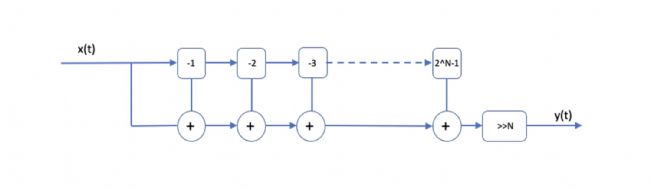 這種濾波器在降低信號噪聲方面具有非常有用的應用。對于不相關(guān)的白噪聲,此移動平均函數(shù)z適合抑制噪聲并保留尖銳的階躍響應,但阻帶性能較差。在硬件中實現(xiàn)這一點僅需要加法器和一次除法,因此在硬件資源有限的情況下非常有用。在硬件中,除以任意數(shù)字在FPGA中并不簡單。通常,該濾波器是通過確保n是2的冪(即n =2N)來實現(xiàn)的,從而將除法減少為右移N個二進制位。
