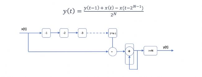 這說明每個輸出取決于先前的輸出和當前的輸入,F(xiàn)在,我們已將移動平均簡化為一個累加器、一個減法器和一個n級移位寄存器,后者用于2N除法的按位右移。當N > 4時,硬件明顯有了節(jié)省,限制因素是2N級移位寄存器。此外,不需要更多的時鐘元件來滿足時序限制。