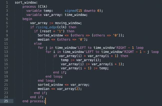 圖11顯示了VHDL五點中值函數(shù)的實現(xiàn)。在時鐘信號的每個上升沿,圖11中的函數(shù)將五個輸入樣本從低值到高值排序。這種排序發(fā)生在第12行到第20行的兩個嵌套“for"循環(huán)中。因此,中位數(shù)是排序窗口中的第三個樣本;這被分配給第22行的輸出。