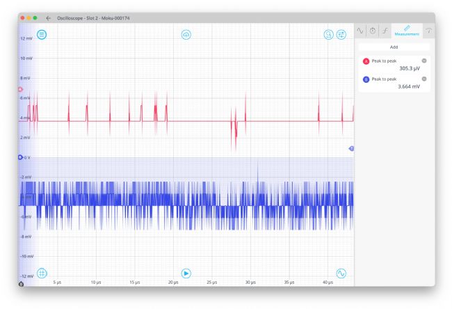 圖7顯示了 Moku:Go 輸入噪聲(藍色線)和幅度分別為161.2 mV和9.162 mV的移動平均濾波器信號(紅色線)。由此我們可以看出,濾波器后的噪聲幅度接近于原始噪聲的預期因子1/16,即 9.162/161.2 = 0.057。該過濾器正在運行并滿足我們的期望。