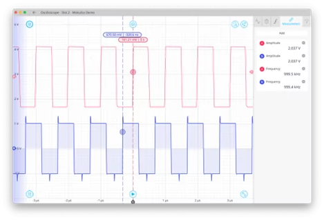 插槽1插入MCC移動平均濾波器,插槽2插入示波器儀器。我們使用示波器觀察從輸入1輸入的的已濾波和未濾波信號。示波器還具有一個集成波形發(fā)生器,用于生成測試信號。在本例中,我們使用示波器的內(nèi)置波形發(fā)生器生成2 kHz 的方波,并將其連接到輸出1。我們在外部將信號衰減 60 dB,使其接近Moku:Go的本底噪聲。然后我們將該信號路由回輸入1。