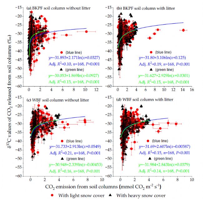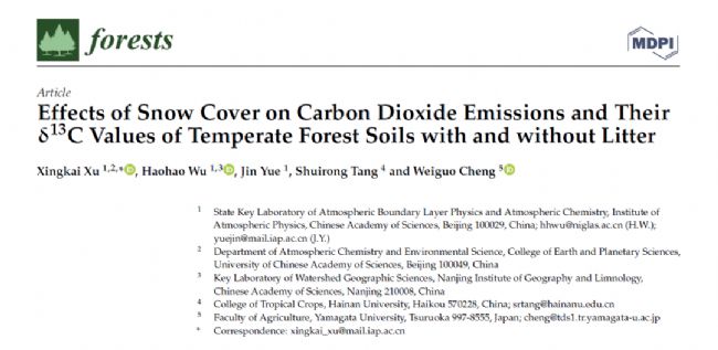 永凍層和季節(jié)性積雪區(qū)域占全球陸地表面的60%左右,占全球土壤有機(jī)碳(C)儲(chǔ)量的70%以上。積雪直接影響表土和大氣之間的熱交換,減少土壤溫度波動(dòng)的影響。在嚴(yán)寒條件下,較厚的積雪可防止土壤結(jié)霜,為地下微生物活動(dòng)提供相對(duì)穩(wěn)定的生活環(huán)境。然而,在全球氣候變化背景下,北半球春季陸地積雪面積正逐年減少,預(yù)計(jì)本世紀(jì)末將減少25%。季節(jié)性積雪模式對(duì)全球氣候變化具有復(fù)雜且多樣的響應(yīng),可能會(huì)通過(guò)光、熱、水和養(yǎng)分等資源再分配來(lái)影響森林生態(tài)系統(tǒng)的地上和地下過(guò)程。土壤呼吸作為土壤C循環(huán)的重要過(guò)程,占據(jù)森林生態(tài)系統(tǒng)呼吸的60%以上,氣候變化導(dǎo)致的土壤呼吸的微小變化甚至?xí)鹕稚鷳B(tài)系統(tǒng)呼吸的重大變化。積雪和氣溫升高之間的相互作用影響土壤凍融循環(huán),導(dǎo)致土壤性質(zhì)和土壤CO2排放的變化。作者認(rèn)為冬季積雪會(huì)影響不同季節(jié)土壤微生物呼吸及其δ13C值,且會(huì)隨著林分和凋落物的存在而變化,然而,目前,關(guān)于該方向的研究十分有限。