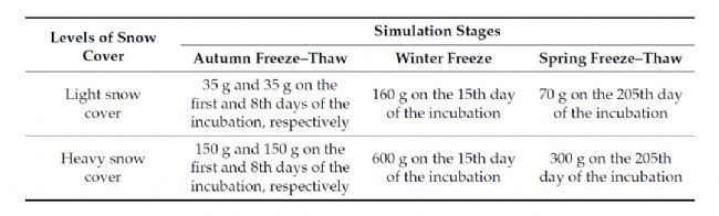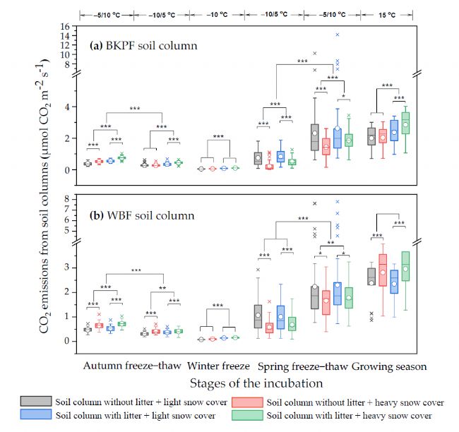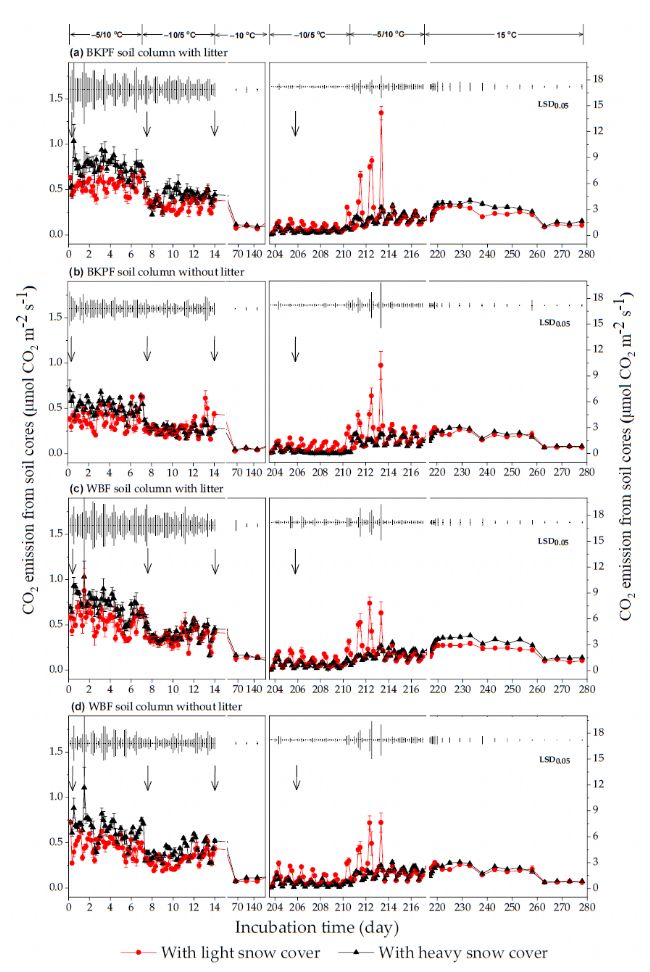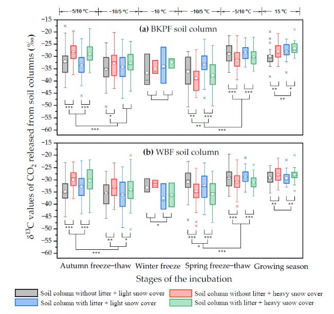 基于此,為盡可能降低其他環(huán)境因素的影響,研究者們?cè)陂L(zhǎng)白山森林生態(tài)系統(tǒng)國(guó)家野外科學(xué)觀測(cè)研究站附近的溫帶森林林地(溫帶紅松闊葉混交林(BKPF)和白樺林(WBF))采集帶有凋落物的土柱帶回實(shí)驗(yàn)室,一半去除凋落物,一半保留。人工雪(輕/重)覆蓋,根據(jù)野外土壤溫度和氣溫的全年變化,利用低溫培養(yǎng)箱進(jìn)行長(zhǎng)期培養(yǎng)實(shí)驗(yàn),合理設(shè)置不同季節(jié)的模擬溫度水平變化。利用SF-3000+碳同位素分析儀測(cè)定土柱中的CO2排放量及土壤呼吸CO2的δ13C以研究人工積雪和凋落物的存在對(duì)中國(guó)東北長(zhǎng)白山地區(qū)典型溫帶森林土壤異養(yǎng)呼吸及其δ13C值的影響。