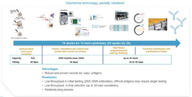 MImAbs是一個專注于發(fā)現(xiàn)和表征免疫治療抗體的研發(fā)平臺。MImAbs初期建立雜交瘤抗體平臺,其平均篩選通量為2000-3000個克隆,從免疫小鼠到純化得到leads抗體的時間需要4.5個月到5個月(圖1)。由于篩選的通量較低,得到最終可用于下游驗(yàn)證的抗體數(shù)和抗體多樣性可能不足,尤其是針對一些困難抗原的時候。
