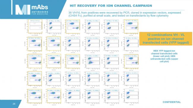 在免疫效果更高的#8小鼠骨髓和脾臟漿B細(xì)胞中,Beacon®發(fā)現(xiàn)了30個經(jīng)過驗(yàn)證為陽性的hits。另外兩只滴度較低的小鼠內(nèi),Beacon®也篩選到15個陽性hits。其中30對VH-VH通過流式細(xì)胞術(shù)和瞬時轉(zhuǎn)染表達(dá)該靶點(diǎn)的細(xì)胞系進(jìn)行驗(yàn)證,12個VH-VL能夠結(jié)合表達(dá)了對應(yīng)離子通道的細(xì)胞(圖7)。后續(xù)的研究工作還在進(jìn)行當(dāng)中。