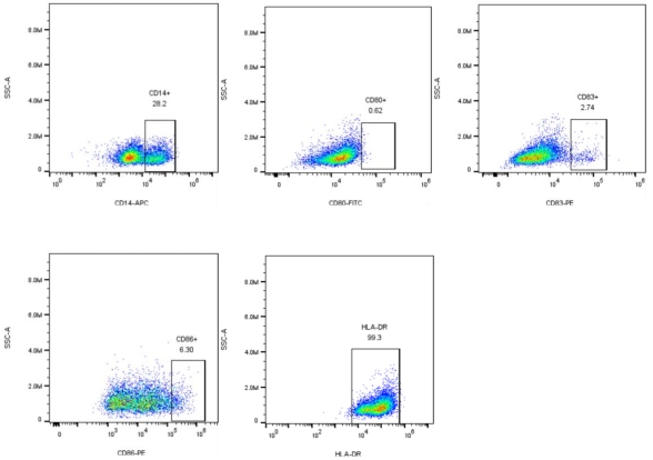 將經(jīng)體外誘導(dǎo)得到的DC細(xì)胞經(jīng)CD14+、CD80+、CD83+、CD86+和HLA-DR+等5種流式抗體檢測(cè),得到較高的誘導(dǎo)率。