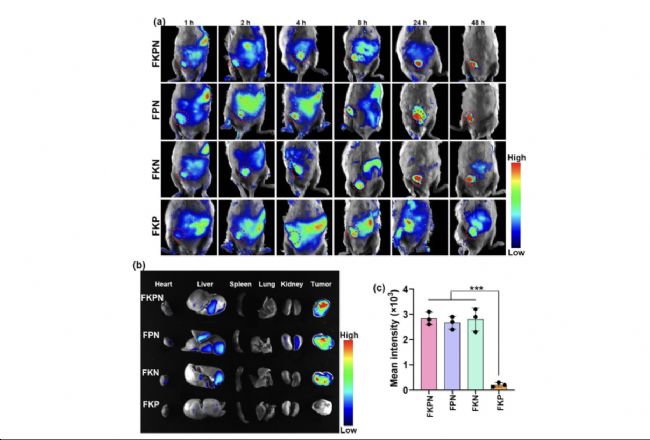 (b) 注射不同顆粒后 24 小時小鼠腫瘤和主要器官的離體熒光成像結(jié)果