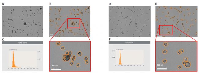 應(yīng)用AsPC-1 (A-C)和DLD-1 (D-F)細胞系來確認不同尺寸混合的計數(shù)性能。