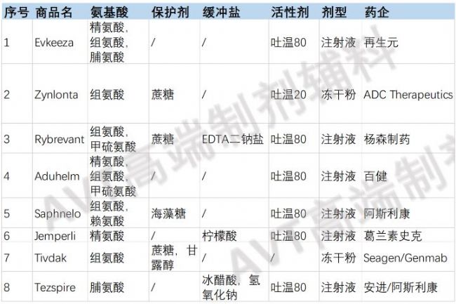 由上表可見,8款抗體新藥中均使用了氨基酸輔料。