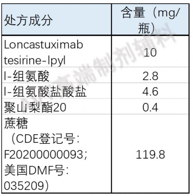 ZYNLONTA (loncastuximab tesirine-lpyl)是一種無菌,白色至米白色,不含防腐劑的凍干粉末,外觀像蛋糕,在重溶和稀釋后用于靜脈注射。每個單劑量瓶用2.2mL無菌注射用水復(fù)配后,最終濃度為5mg/mL, pH約6.0。