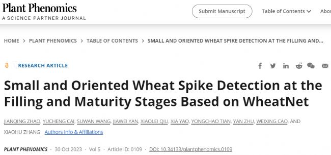2023年10月,Plant Phenomics 在線發(fā)表了南京農(nóng)業(yè)大學(xué)題為Small and Oriented Wheat Spike Detection at the Filling and Maturity Stages Based on WheatNet的研究論文。