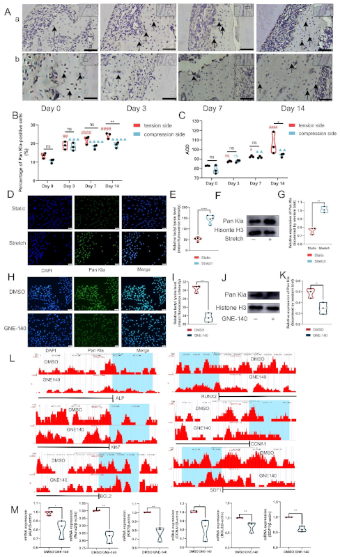 (A、B)OTM 期間,IHC 在張力側(cè)(a)和壓力側(cè)(b)測定的組蛋白乳酸化水平。組蛋白乳酸化水平由 Pan-Kla 陽性細(xì)胞(B)和 AOD(C)的百分比確定。(D、E)有或沒有周期拉伸下乳酸化組蛋白的水平由 IF 確定。(F、G)有或沒有周期拉伸下乳酸化組蛋白的水平由 WB 確定。(H、I)GNE-140/DMSO 處理組中由 IF 測定的乳酸化組蛋白水平。(J、K)在 GNE-140/DMSO 處理組中WB 測定的乳酸化組蛋白水平。(L)相關(guān)基因位點(diǎn)組蛋白乳酸化染色質(zhì)免疫沉淀測序信號的基因組快照。(M)DMSO/GEN-140 組中代表基因在 mRNA 水平上的表達(dá)。
