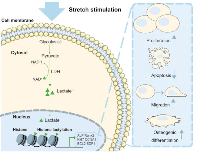 圖4 拉伸刺激的乳酸通過組蛋白乳酸化促進(jìn)ABMMCs中ALP、Runx2、Ki67、CCNA1、BCL2和SDF1的表達(dá)。在拉伸刺激下,ABMMCs中乳酸的產(chǎn)生可以升高。拉伸誘導(dǎo)的乳酸通過相關(guān)基因的組蛋白乳酸化進(jìn)一步促進(jìn)ABMMCs的增殖、遷移和成骨分化。ABMMCs:牙槽骨骨髓間充質(zhì)細(xì)胞;NADH:煙酰胺腺嘌呤二核苷酸;LDH:乳酸脫氫酶。