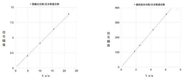 分別把茶堿、咖啡因的水合物和無水物按照重量比例0/100、25/75、50/50、75/25和100/0(%w/w)進(jìn)行混合,然后選擇對應(yīng)序列進(jìn)行測試,得到信號強(qiáng)度和時間,將不同混合度的結(jié)果進(jìn)行線性擬合,顯示了非常好的線性度(茶堿R2=0.998,咖啡因R2=1)。[4]