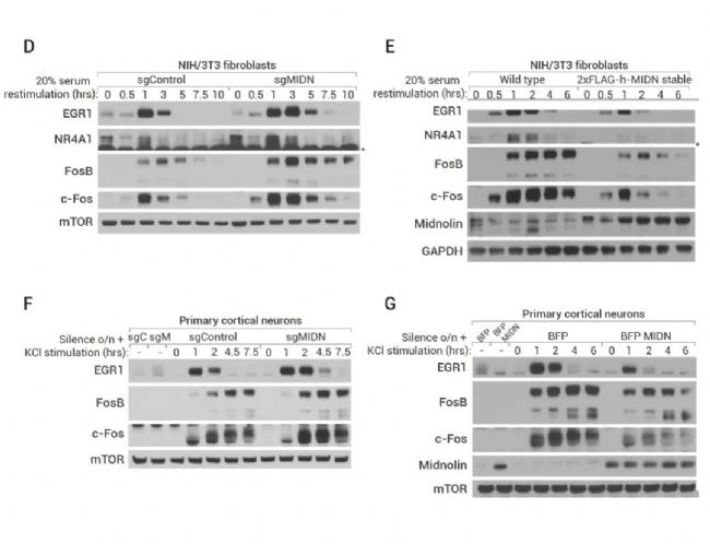 A-C:遺傳學篩選顯示 Midnolin 是 IEGs 蛋白降解的調節(jié)。(A) 構建穩(wěn)定表達 EGR1 或 FosB GPS 報告基因的 HEK-293T 細胞系并進行全基因組 CRISPR-Cas9 篩選示意圖。(B-C) 遺傳篩選結果,顯示 MIDN 是負調節(jié) EGR1 和 FosB 穩(wěn)定性的熱點基因。D-G:Midnolin促進生理環(huán)境中多種 IEG 蛋白的降解。(D-E) NIH/3T3 細胞中敲除/過表達 Midnolin 對 EGR1、FosB、c-Fos 和 NR4A1 蛋白水平的影響; (F-G) 初級皮層神經(jīng)元中敲除/過表達 Midnolin 對 EGR1、FosB、c-Fos 和 NR4A1 蛋白水平的影響。