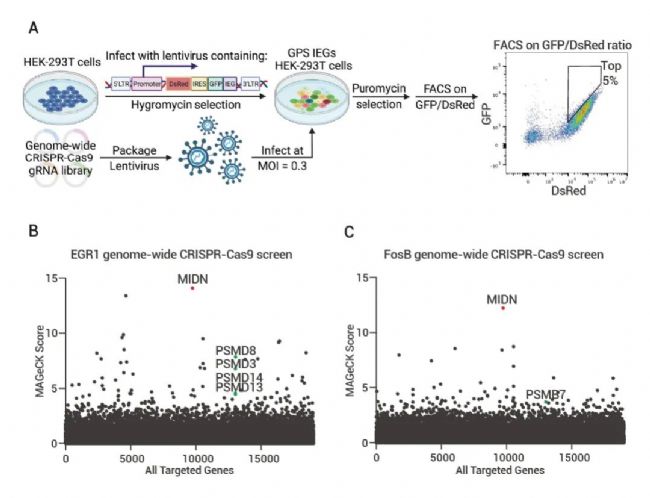 Michael E. Greenberg 團隊通過全基因組 CRISPR-Cas9 篩選調控 IEGs 蛋白穩(wěn)定性的基因,發(fā)現(xiàn)了一種哺乳動物中基本未被表征過的 Midnolin 蛋白,其可以促進不同 IEGs 蛋白的蛋白酶體降解。進而發(fā)現(xiàn)了一種全新的蛋白降解機制——Midnolin-蛋白酶體途徑。