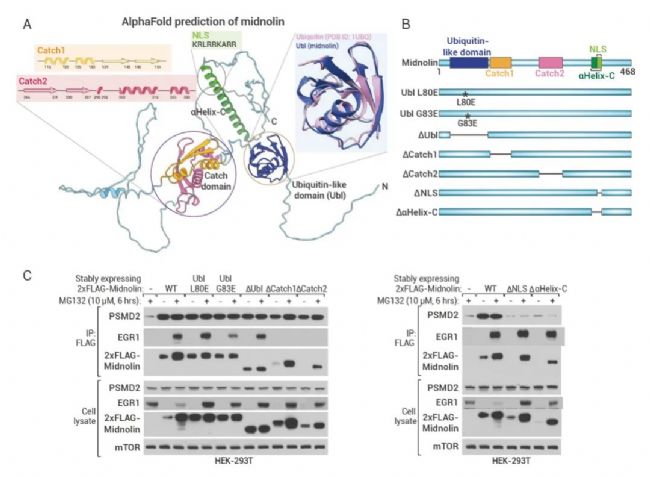 (A) AlphaFold 預測的 Midnolin 結構; (B) 引入 Midnolin cDNA 的突變或截短的示意圖; (C) 使用 CMV 啟動子對 HEK-293T 細胞穩(wěn)定表達 2XFlag Midnolin,用 10 μM MG132 處理細胞 6 小時,并進行免疫印跡。