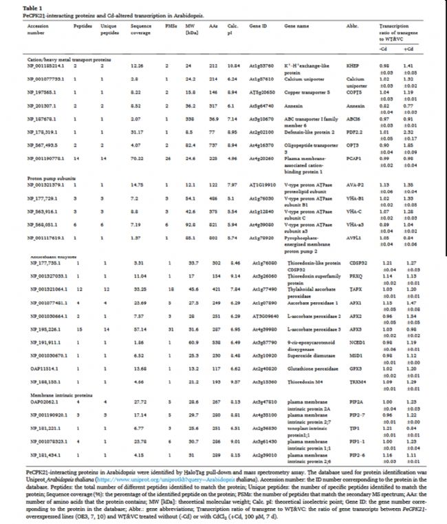 該研究借助HaloTag pull-down技術(shù),富集了PeCPK21相互作用蛋白,Cd處理后相應(yīng)的表達(dá)譜表明,PeCPK21與重金屬脅迫相關(guān)蛋白(HMAPs)相互作用,介導(dǎo)了轉(zhuǎn)基因擬南芥對Cd的耐受性。