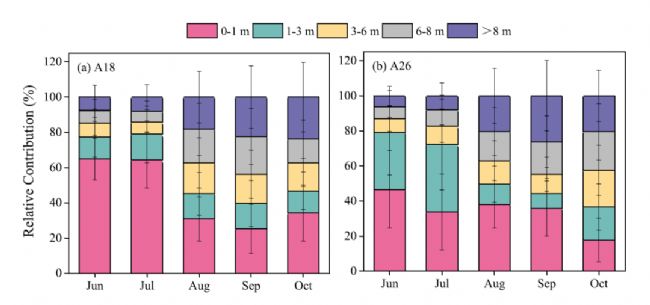 2020年生長(zhǎng)季(a)18年生和(b)26年生蘋(píng)果樹(shù)不同層土壤水對(duì)木質(zhì)部水分的相對(duì)貢獻(xiàn)(采用2H18O與MixSIAR模型最佳組合)。