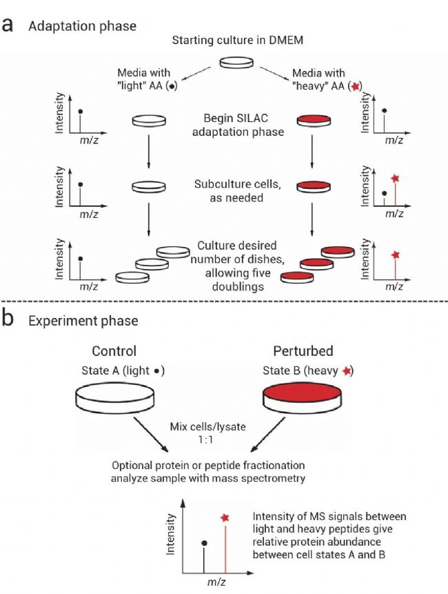 基于代謝將穩(wěn)定同位素標(biāo)記的氨基酸整合到整個蛋白質(zhì)組中,兩組細(xì)胞同時培養(yǎng),一組是包含正常(輕)氨基酸(Light)的培養(yǎng)基培養(yǎng)(圖 1a,左),另一組組則為同位素標(biāo)記或者含有“重型(Heavy)”的氨基酸培養(yǎng)基(圖 1a,右)。