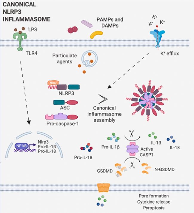 1. 啟動過程 (信號 1):包括通過 TLR 識別 PAMP/DAMP 和/或通過 TNFR 感測 TNFα,從而通過 NF-κB 信號傳導(dǎo)誘導(dǎo) NLRP3、pro-IL-1β 和 pro-IL-18 蛋白的表達(dá)。3. 效應(yīng)過程:NLRP3 炎癥小體的寡聚化和激活導(dǎo)致 Pro-Caspase-1 轉(zhuǎn)變?yōu)榛钚孕问?Caspase-1,Caspase-1 進(jìn)而剪切下游分子 Pro-IL-1β 和 Pro-IL-18 以及 GSDMD (Gasdermin D),從而導(dǎo)致 IL-1β 和 IL-18 的釋放以及 N-GSDMD 的形成;N-GSDMD 進(jìn)入細(xì)胞膜,形成孔結(jié)構(gòu),將成熟的 IL-1β 和 IL-18 釋放到細(xì)胞外空間,誘導(dǎo)細(xì)胞焦亡并引起炎癥。