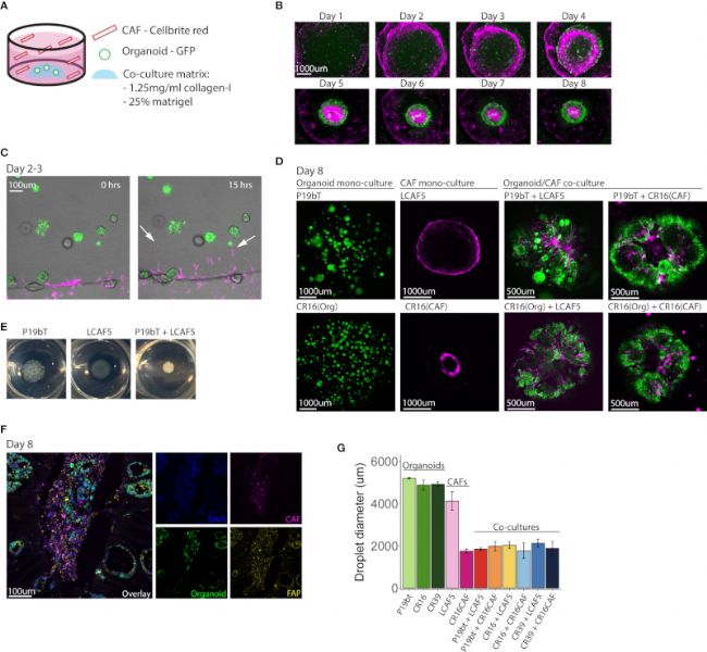 在共培養(yǎng)模型中,首先將小類(lèi)器官接種在含有基質(zhì)膠和膠原蛋白I 的共培養(yǎng)基質(zhì)中,然后在共培養(yǎng)基中加入CAFs(圖1A)。在最初的2-3天內(nèi),CAFs在含有類(lèi)器官的基質(zhì)液滴周?chē)M織成一個(gè)連續(xù)的圓圈(圖1 B、C)。在液滴內(nèi),CAFs組織成基質(zhì)軌跡,同時(shí),類(lèi)器官沿著這些CAFs軌跡重組。最終,所有單獨(dú)的類(lèi)器官融合成一個(gè)圍繞 CAF 軌道的單個(gè)實(shí)體 (圖1 D),形成肉眼可見(jiàn)的“微型腫瘤”(圖1 E)。這些數(shù)據(jù)表明,在優(yōu)化條件下與腫瘤細(xì)胞共培養(yǎng)CAFs會(huì)導(dǎo)致自發(fā)的ECM重組和類(lèi)似腫瘤組織的上層結(jié)構(gòu)的組裝。目前尚不清楚是什么原因?qū)е铝思?xì)胞重組。