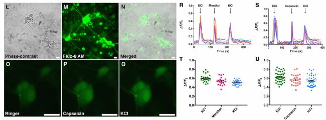 圖4. (L至N)與Fluo-8 AM孵育后,ABI誘導的iSG和相應的熒光信號結(jié)果圖,比例尺:20μm。(O至Q)在Ringe(O)、10μM Capsaicin(P)和100 mM KCl(Q)中,熒光強度顯示的鈣離子變化。比例尺,20μm。(R)對10μM Menthol和100 mM KCl的代表性鈣反應。鈣反應計算為熒光(∆F)比初始基線熒光(F0)的變化。(S)對10μM Capsaicin和100 mM KCl的代表性鈣反應。(T和U)散點圖顯示了單個細胞對Menthol、Capsaicin或KCl的積極反應。