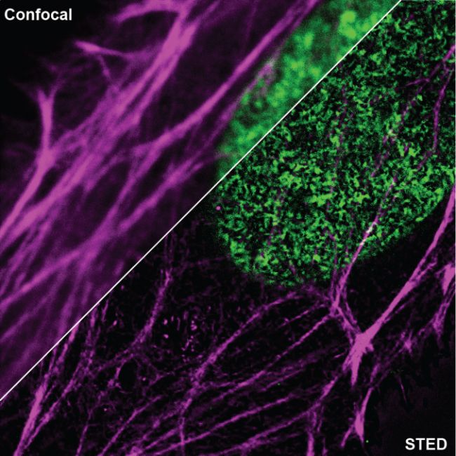圖1. 結(jié)構(gòu)化照明顯微鏡(Structured illumination microscopy,SIM)下,使用SIR -tubulin(左)或SIR -actin(右)染色的人成纖維細(xì)胞。