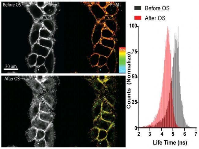 圖7. 使用Flipper-TR®探針對(duì)細(xì)胞進(jìn)行染色。在高滲透沖擊前(上)和沖擊后(下)染色的Flipper-TR®圖像;叶缺硎緹晒鈴(qiáng)度,彩色編碼表示熒光壽命。右邊的直方圖顯示了滲透沖擊后的壽命變化。