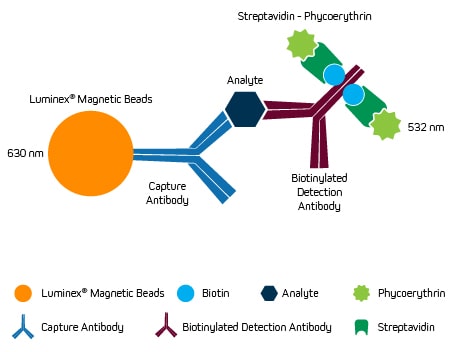 xMAP®技術基于使用彩色編碼珠,這些珠子用不同比例的兩種熒光基團(一種紅色,一種紅外線)染色,以提供獨特的光譜特征。在典型的檢測設置中,每組不同光譜的微珠都涂有不同的分析物特異性抗體,并在與樣品孵育前進行初步阻斷。洗滌去除未結合的物質后,加入生物素化的分析物特異性抗體形成夾心復合物,然后再加入鏈霉親和素-藻紅蛋白(PE)共軛物完成組裝。接下來,在基于流式細胞儀的Luminex®儀器上讀取珠子,用紅色(630 nm)激光識別每組珠子,用綠色激光(532 nm)確定 PE 衍生信號的大小,該信號與結合的分析物的量成正比。該裝置如圖 1 所示。
