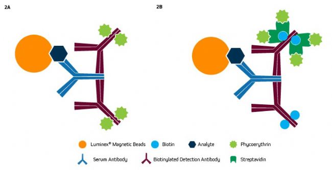 圖2:使用分析物結合的珠子從患者樣本中捕獲抗體,然后使用以下方法進行檢測的Luminex替代裝置:A. PE 結合的抗樣本物種抗體。B. 先用生物素化的抗物種抗體,再用 PE 結合的鏈霉親和素產(chǎn)生信號放大。