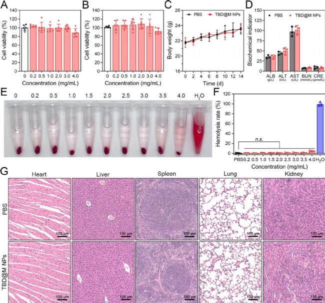圖6評估了TBD@M NPs的生物安全性。體外的CCK-8試驗和體內(nèi)的血液生化指數(shù)試驗、溶血實驗、組織病理學評估都說明TBD@M NPs表現(xiàn)出非常強的生物相容性,具有良好的臨床轉(zhuǎn)化潛力。