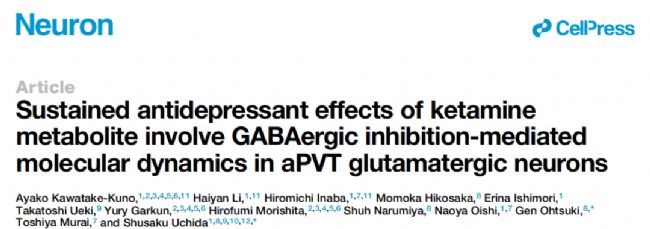 2024年2月京都大學(xué)Shusaku Uchida團隊在Neuron雜志上發(fā)表文章揭示了氯胺酮代謝產(chǎn)物(2S,6S)-HNK發(fā)揮長效抗抑郁作用的分子和細(xì)胞機制。