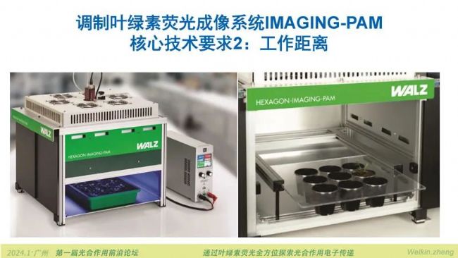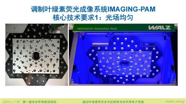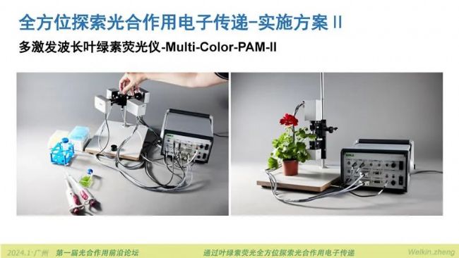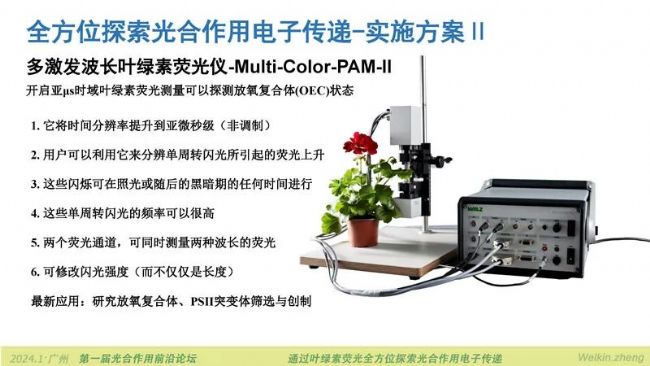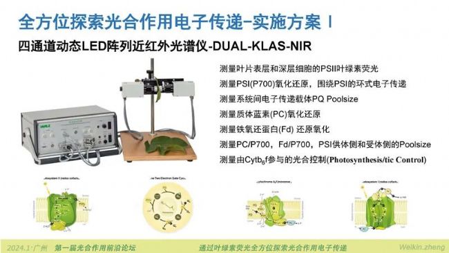 2024年1月5日-7日,由廣東省植物生理學(xué)會主辦,廣州中醫(yī)藥大學(xué),華南農(nóng)業(yè)大學(xué)承辦的第一屆光合作用前沿論壇在廣州大學(xué)城中心酒店南粵廳順利召開,小編作為贊助商工程師受邀作“通過葉綠素?zé)晒馊轿惶剿鞴夂献饔秒娮觽鬟f”的報(bào)告。報(bào)告首先從全方位探索光合作用電子傳遞的技術(shù)路線入手,化整為零的給所有參會老師展示了光合作用電子傳遞鏈上可以被測量的步驟與環(huán)節(jié)。然后再從全方位探索光合作用電子傳遞的實(shí)施方案展開,介紹了四通道動(dòng)態(tài)LED陣列近紅外光譜儀DUAL-KLAS-NIR如何完成光合作用電子傳遞全過程的通關(guān)式測量。隨后介紹的新款多激發(fā)波長葉綠素?zé)晒鈨xMulti-Color-PAM-II可以檢測放氧復(fù)合體S*狀態(tài),可以測量高能淬滅HIQ,補(bǔ)齊原初電子供體水氧化裂解的環(huán)節(jié)以及光系統(tǒng)Ⅱ天線內(nèi)部能量傳遞與淬滅相關(guān)過程的測量。完美的閉環(huán)了通過葉綠素?zé)晒馊轿惶剿鞴夂献饔秒娮觽鬟f的解決方案。除此之外,小編還在報(bào)告中展示了植物多酚葉綠素?zé)晒鈨xLSA-2050,蜂巢矩陣葉綠素?zé)晒獬上裣到y(tǒng)HEXAGON-IMAGING-PAM,超便攜調(diào)制葉綠素?zé)晒鈨x氣孔計(jì)附件MINI-PAM-Ⅱ/Porometer。新技術(shù)和新產(chǎn)品吸引了大量老師的關(guān)注,紛紛舉起手機(jī)拍照記錄。為方便大家進(jìn)一步詳細(xì)了解報(bào)告的全部內(nèi)容,現(xiàn)將PPT及講稿分享如下。