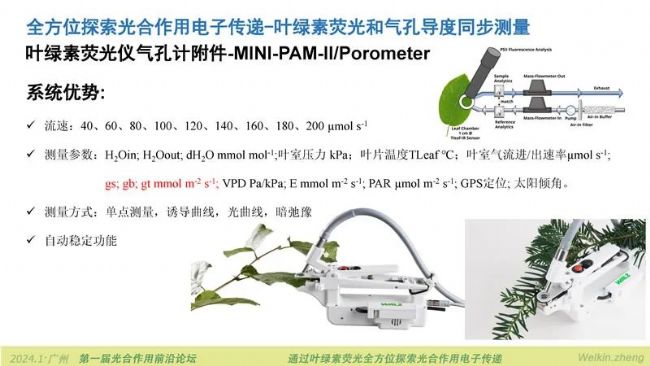 最后要跟大家分享的一個(gè)新產(chǎn)品是便攜式葉綠素?zé)晒鈨x的氣孔計(jì)附件MINI-PAM-Ⅱ/Porometer。它的特點(diǎn)是流速設(shè)置范圍大,測量氣體交換慢的陰生植物,如中草藥和氣體交換強(qiáng)的植物,如糧食作物都可以輕松應(yīng)對。