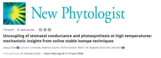 2024年2月1日,New Phytologist在線刊發(fā)瑞士聯(lián)邦森林、雪與景觀研究所Haoyu Diao等人標(biāo)題為Uncoupling of stomatal conductance and photosynthesis at high temperatures: mechanistic insights from online stable isotope techniques的研究文章。該研究對(duì)四種常見(jiàn)的歐洲樹(shù)種進(jìn)行了葉片氣體交換和在線同位素鑒別的綜合測(cè)量,葉片溫度范圍為 5-40°C,同時(shí)保持恒定的葉-大氣水汽壓差(0.8 kPa),而不受到土壤水分的限制。