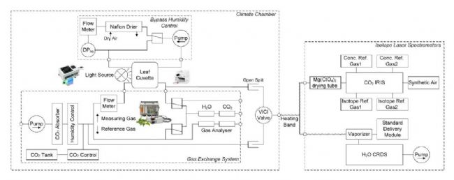二氧化碳(CO2)和水(H2O)中的穩(wěn)定同位素已被用于提高我們對(duì)葉片氣體交換各種過(guò)程的認(rèn)識(shí),因?yàn)樵谶@些過(guò)程中會(huì)同時(shí)發(fā)生同位素分餾。紅外氣體分析儀和同位素激光光譜儀的組合儀器有助于在受控條件下實(shí)時(shí)測(cè)量進(jìn)出葉片氣體交換室的CO2和H2O中的C和氧(O)同位素組成(δ13C 和 δ18O)。這樣就可以追蹤C(jī)O2和H2O沿葉綠體、細(xì)胞壁、氣孔和葉片邊界層移動(dòng)的路徑,從而提供有關(guān)葉片生理過(guò)程的更多信息。光合 13C 判別(Δ13C)受細(xì)胞間(ci)和葉綠體CO2分子分?jǐn)?shù)(cc)的調(diào)節(jié),反映了葉片氣體交換過(guò)程中An和gs之間的相互作用。CO2分子中的18O分餾發(fā)生在碳酸酐酶(cca)催化部位,CO2和H2O中的18O在此平衡。葉綠體表面被認(rèn)為是平衡的主要場(chǎng)所。平衡后的CO2可以擴(kuò)散回來(lái),與擴(kuò)散到細(xì)胞間空氣空間的大氣中的CO2混合。假定葉綠體表面 H2O 的 δ18O與蒸發(fā)部位的H2O δ18O非常接近,則細(xì)胞間空氣空間中CO2的 δ18Oi可用于推斷蒸發(fā)部位葉片水分的18O富集情況。根據(jù)Craig–Gordon模型,這在很大程度上取決于葉片外部與內(nèi)部水蒸氣壓的比值(如果假定葉片溫度接近環(huán)境空氣溫度,則等于相對(duì)濕度)。