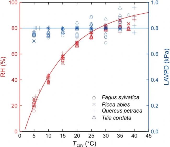 圖1 相對(duì)濕度(RH)和葉片-大氣水汽壓差(LAVPD)隨葉室溫度(Tcuv)升高而變化。