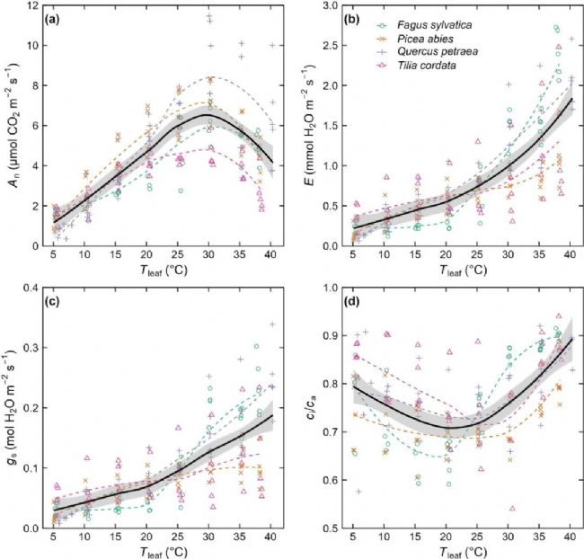 四個(gè)物種的氣體交換參數(shù)(An、E、gs 和 ci/ca)對(duì)葉綠素的響應(yīng)總體上是一致的。一般來(lái)說(shuō),An首先升高,在約30°C時(shí)達(dá)到峰值,然后隨著 Tleaf的進(jìn)一步升高而降低(F=108.63,P<0.001)。在測(cè)試的最高溫度(40°C)下,An下降到與15-20°C時(shí)相似的水平。相比之下,所有物種的 E 對(duì)Tleaf的增加都呈曲線上升(F=229.54,P<0.001)。由于 An 和 E 對(duì)溫度的反應(yīng)不同,WUE 隨著Tleaf的增加而增加,直到約 25°C,然后隨著Tleaf的進(jìn)一步增加而急劇下降到近 2 mmol CO2 mol-1 H2O(F=62.58,P<0.001)。與 E 相似,gs 也隨著 Tleaf 的增加而增加(F = 183.54,P < 0.001);然而,GAM顯示,gs隨Tleaf的增加而增加的趨勢(shì)可以用線性關(guān)系充分描述,因?yàn)閿M合模型中的平穩(wěn)項(xiàng)在統(tǒng)計(jì)上并不顯著(P = 0. ci/ca 最初隨著溫度葉片的增加而降低,在 20-25°C 時(shí)達(dá)到最小值,然后隨著溫度葉片的進(jìn)一步增加而升高(圖 2d;F = 40.38,P < 0.001)。請(qǐng)注意,與其他物種相比,F. sylvatica的gs和E在溫度范圍的低端(5-20°C;圖 2b,c)對(duì)Tleaf變化的反應(yīng)相對(duì)較小。因此,F(xiàn). sylvatica的 ci/ca最低值和 WUE 最高值出現(xiàn)在約15-20°C時(shí),而其他物種則出現(xiàn)在約25-30°C時(shí)。
