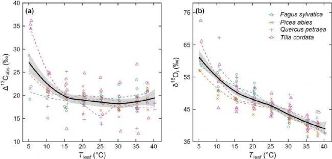 研究發(fā)現(xiàn),在所有物種中,觀察到的13C光合分辨力(Δ13Cobs)對(duì)葉綠素的總體響應(yīng)都很明顯(F=47.16,P<0.001)。隨著葉綠素的增加,Δ13Cobs急劇下降,在5至15°C之間從28.2‰降至19.5‰。超過(guò)約15°C時(shí),Δ13Cobs 變化微妙,平均為 18.7‰。與E和gs對(duì)溫度的積極反應(yīng)相反,δ18Oi隨溫度升高呈曲線下降(F=352.3,P<0.001),所有物種的平均值從61‰降至39‰。