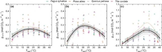 Diao等人的研究表明在受控環(huán)境條件下,當(dāng)溫度超過(guò)光合作用的最適溫度(30°C)時(shí),所有受測(cè)樹(shù)種的氣孔導(dǎo)度(gs)和凈光合速率(An)都會(huì)解偶聯(lián),gs會(huì)增加,而An會(huì)降低。在這種解偶聯(lián)過(guò)程中,葉肉導(dǎo)度(細(xì)胞壁、質(zhì)膜和葉綠體膜傳導(dǎo)率)在不同物種之間持續(xù)顯著下降;然而,這種下降并沒(méi)有導(dǎo)致葉綠體表面和基質(zhì)的二氧化碳濃度降低。