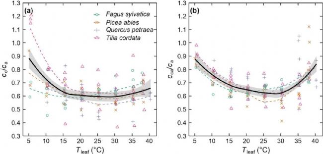 cc/ca和cca/ca對(duì)葉綠素都有顯著的響應(yīng)(分別為 F=20.61,P<0.001和F=38.54,P<0.001)。cca/ca在5至30°C之間呈下降趨勢(shì),然后隨著 Tleaf 的進(jìn)一步升高而急劇上升。