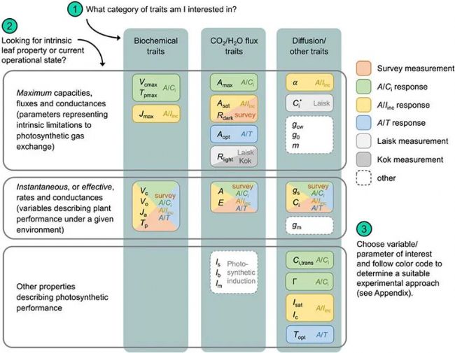 圖1. 如何為自己的研究問題選擇正確的測量參數(shù)。光合特性可分為描述生化和氣體擴散特性的性狀以及進入或流出葉片的氣體通量。因此,第一步是確定氣體交換測量要評估的性狀大類。然后是所關(guān)注的光合特性是與葉片的固有特性有關(guān),還是與葉片在特定環(huán)境條件下的運行狀態(tài)有關(guān)。其他更具描述性的特性也可以通過氣體交換測量來估算。為支持研究問題,文章給出了可以量化的參數(shù),以及適用每種參數(shù)的實驗方法,詳細說明見補充資料 S1。參數(shù)和變量的定義見表 1。