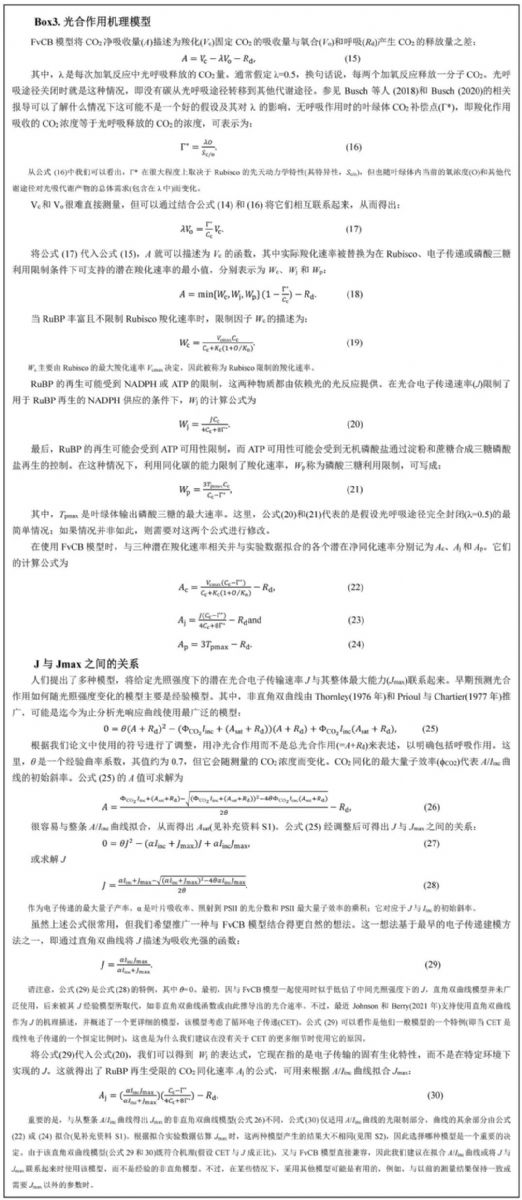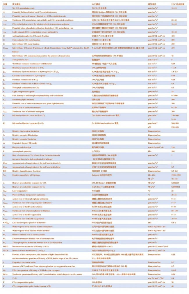 反過來,在已知光合作用參數(shù)的情況下,F(xiàn)vCB模型可以預(yù)測多種環(huán)境條件下的CO2同化。因此,F(xiàn)vCB模型已被廣泛集成到冠層、生態(tài)系統(tǒng)和全球碳通量模型中。由于光合氣體交換參數(shù)在地球系統(tǒng)模型中的核心地位,人們在描述模型參數(shù)的遺傳、發(fā)育和環(huán)境變異方面做出了巨大努力。